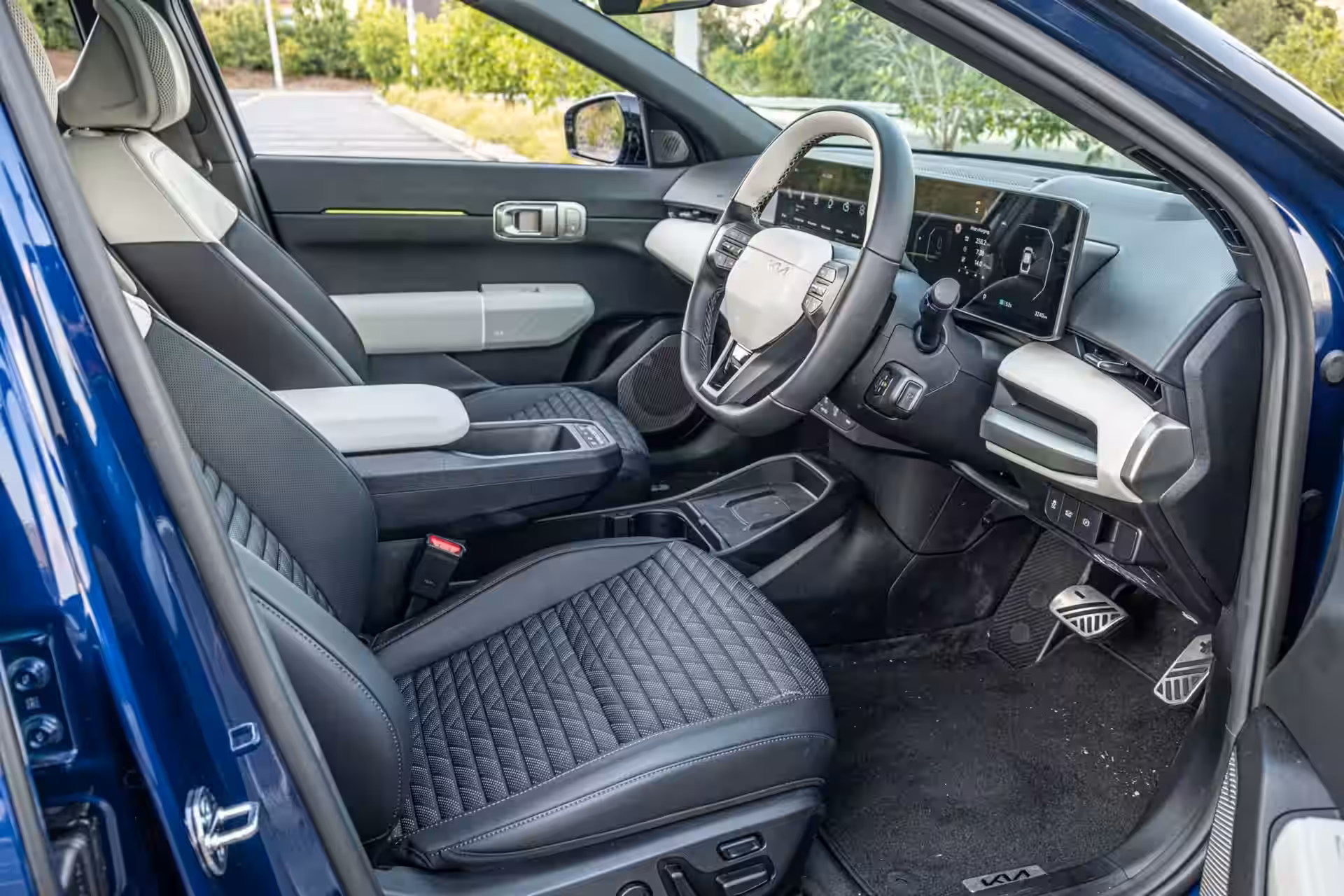 É no habitáculo que o EV4 GT-Line começa a justificar sua posição como um sedã elétrico quase premium. A Kia usa dois displays de 12,3 polegadas nas laterais, ladeando uma tela menor de 5,0 polegadas para o ar-condicionado, criando um layout de painel panorâmico que tem um ar moderno sem cair em truques. A tela do ar-condicionado fica parcialmente escondida atrás do volante, o que não é ideal, mas a Kia compensa com botões físicos de HVAC mais abaixo no painel. Essa combinação de telas e controles “de verdade” torna o habitáculo mais fácil de conviver do que em muitos rivais, que enterram funções básicas dentro de submenus.
