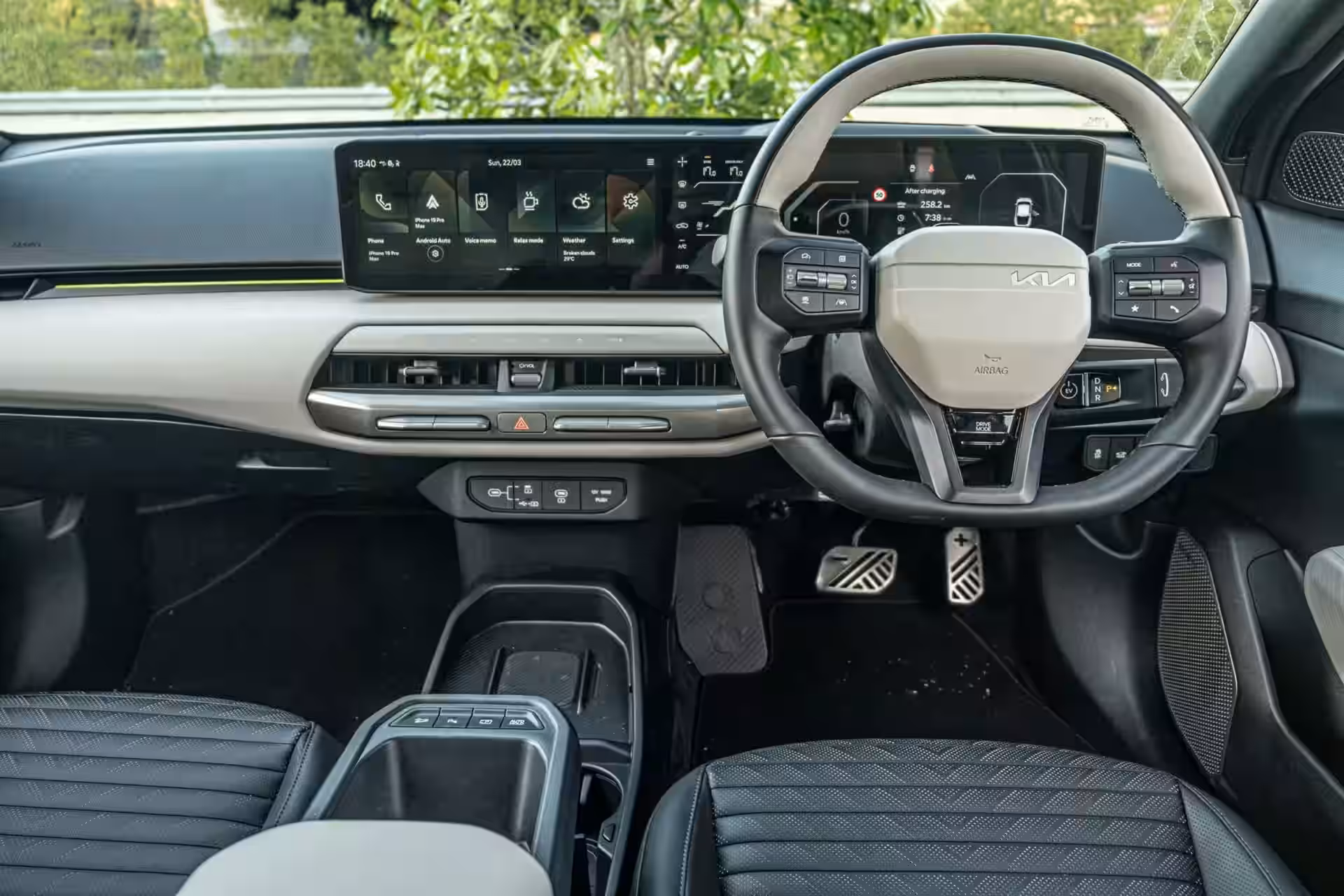 Os materiais também contam. As superfícies parecem mais sofisticadas do que as do EV5, com botões metálicos para as funções do aquecimento do assento e ventilação, posicionados perto das maçanetas das portas, além de uma quantidade útil de espaço de armazenamento entre os bancos e um carregador sem fio para smartphone. As versões GT-Line e Earth adicionam bancos dianteiros premium, com encostos de cabeça macios e reclinamento de um toque, e a possibilidade de baixar os bancos bem mais do que o normal dá a motoristas altos uma folga real de cabeça. Esse tipo de detalhe ergonômico é o que separa um bom EV de um que apenas vem bem equipado. A Kia não tentou tornar o EV4 luxuoso naquele sentido de “madeira falsa” e toque macio. Em vez disso, ela usou o desenho dos assentos, a posição de dirigir e o armazenamento para criar a impressão de cuidado e consideração.