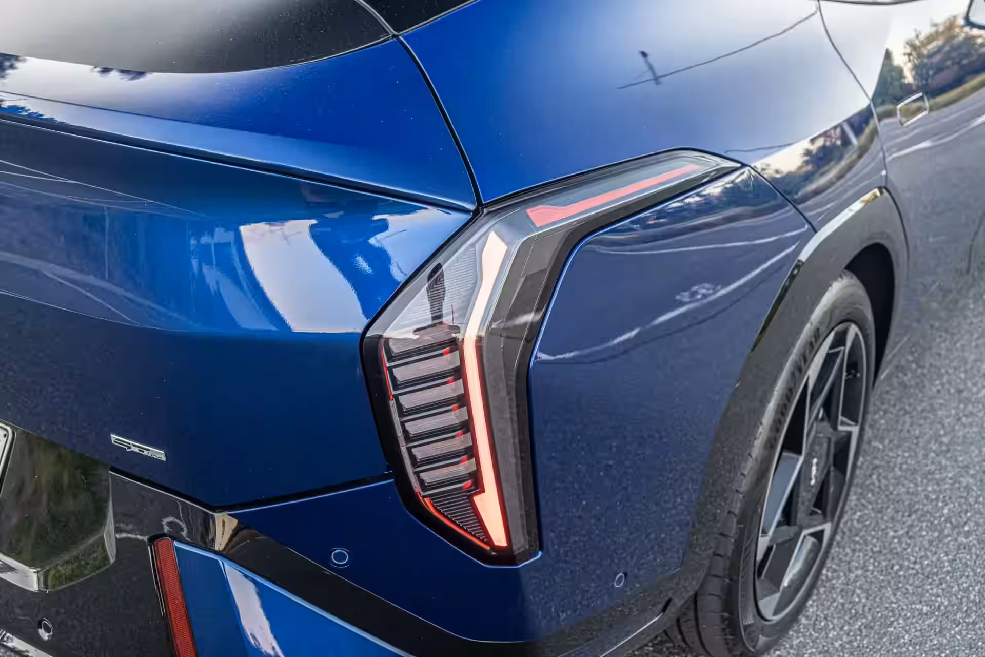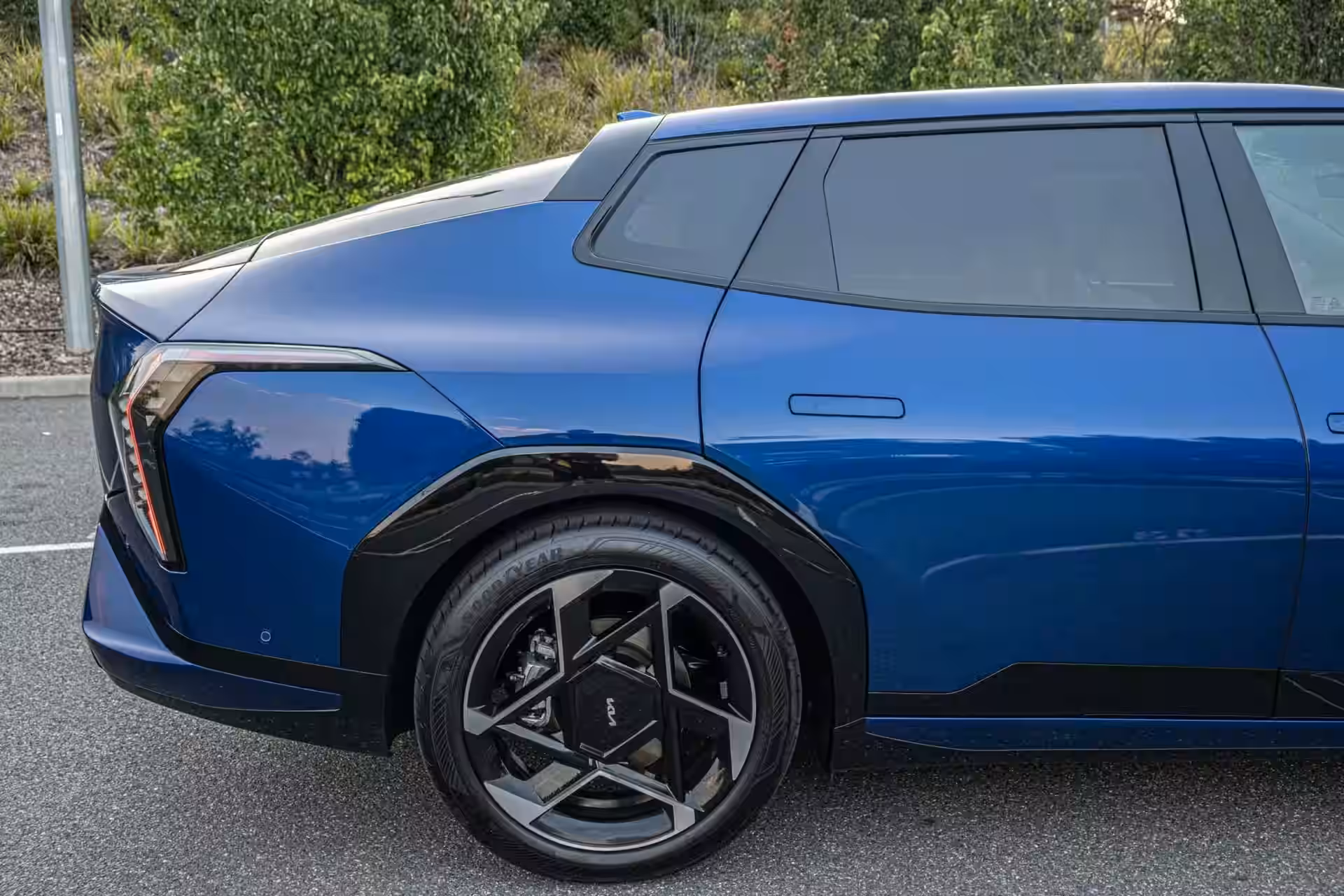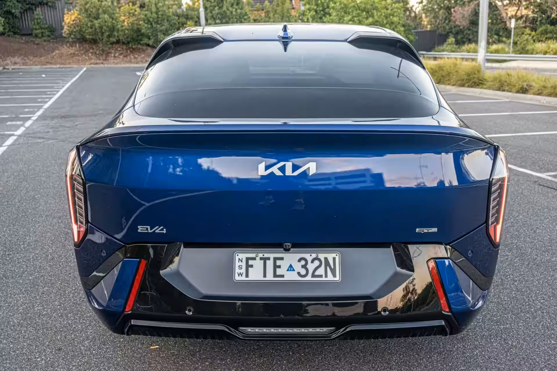 2026 KIA EV4 Gt Line - Blue Sporty Rear Quarter With LED Tail Lights