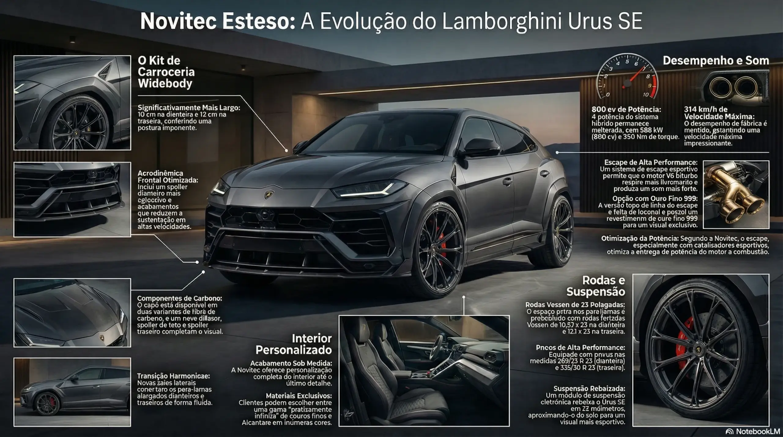 Se você achava que conseguir uma alocação para o SUV mais desejado do planeta já era o auge da exclusividade, pense novamente. Com a produção do modelo de fábrica esgotada até 2026, ter um exemplar na garagem é apenas o primeiro passo para a elite automotiva. A preparadora alemã Novitec acaba de lançar o kit “Esteso” para o LAMBORGHINI URUS SE, transformando o já agressivo híbrido italiano em uma obra de engenharia intimidadora que faz o modelo original parecer comportado. Não se trata apenas de estética; é uma aula de como manipular o fluxo de ar e a acústica sem destruir a complexa calibração de um powertrain eletrificado.