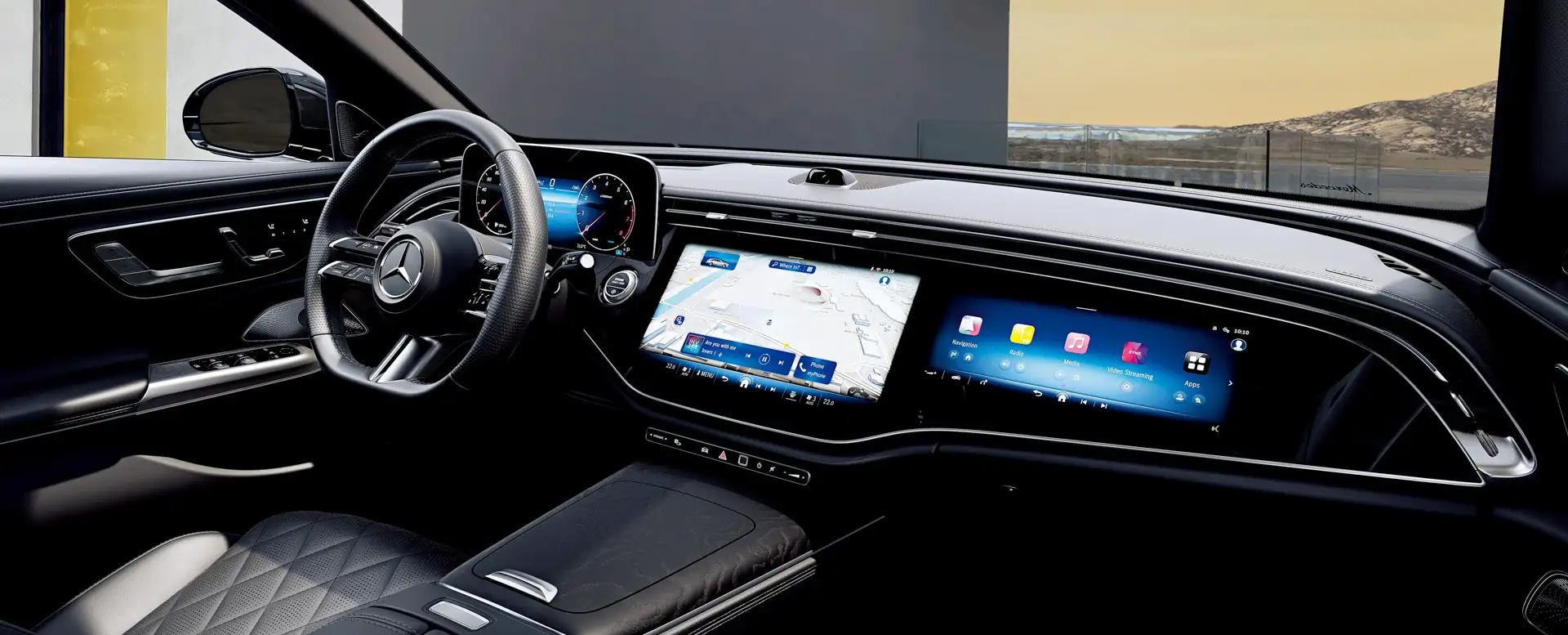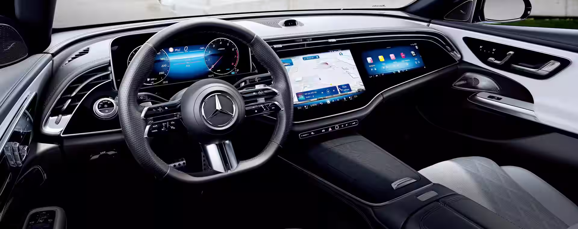 No interior, a Mercedes mantém a fórmula contida. O revestimento ARTICO preto é padrão, o que combina com a lógica visual da Edição Noturna e evita a aparência excessivamente ornamentada que pode enfraquecer uma cabine premium. As soleiras das portas iluminadas mudam para cromo escuro através do Pacote Noturno, um detalhe que se torna mais perceptível à noite do que durante o dia. Nos modelos E 200 e E 220 d, o volante esportivo ganha revestimento em couro Nappa, e os pedais utilizam pinos de borracha, reforçando o conteúdo da Linha AMG com mudanças táteis, em vez de ruído decorativo.