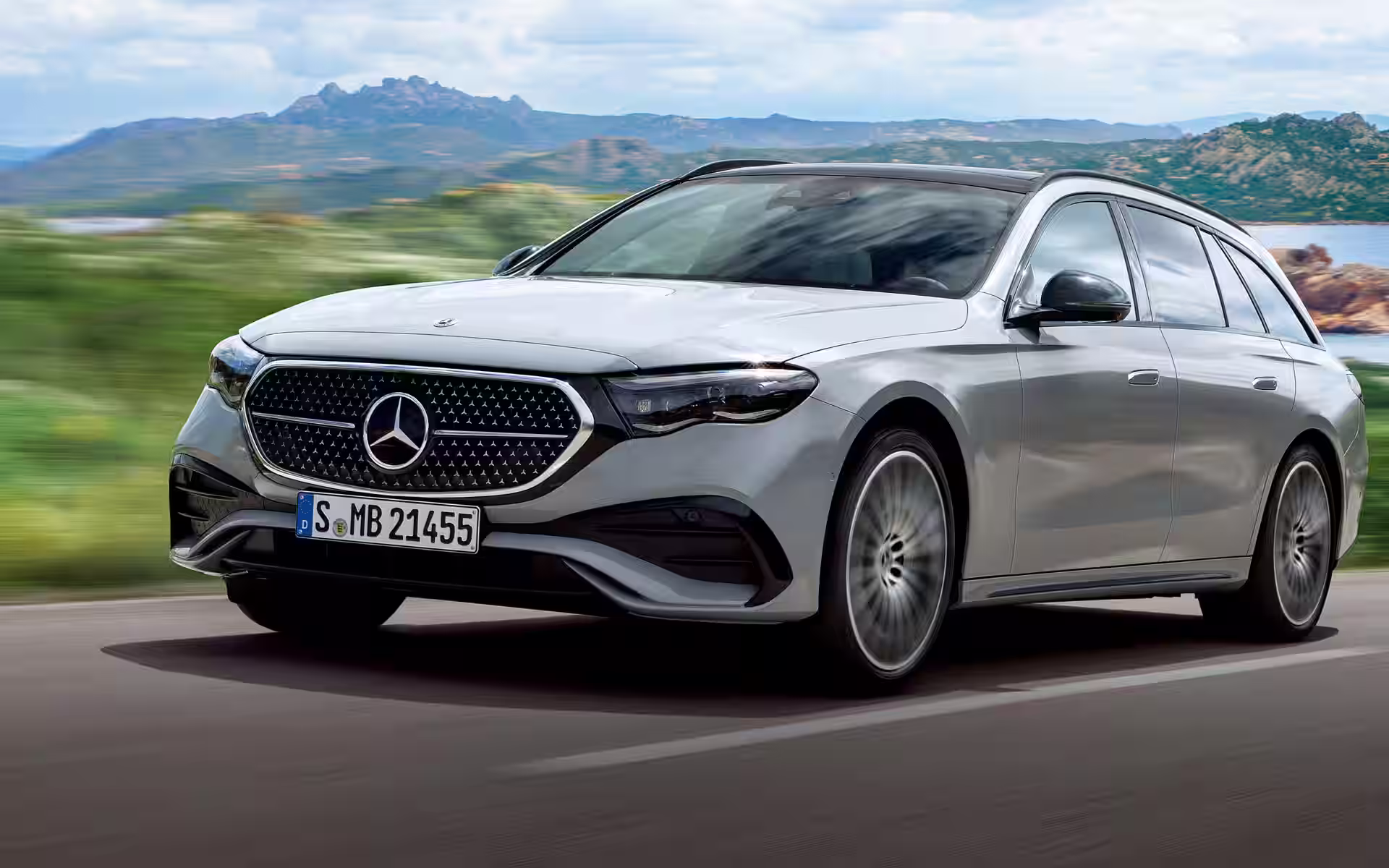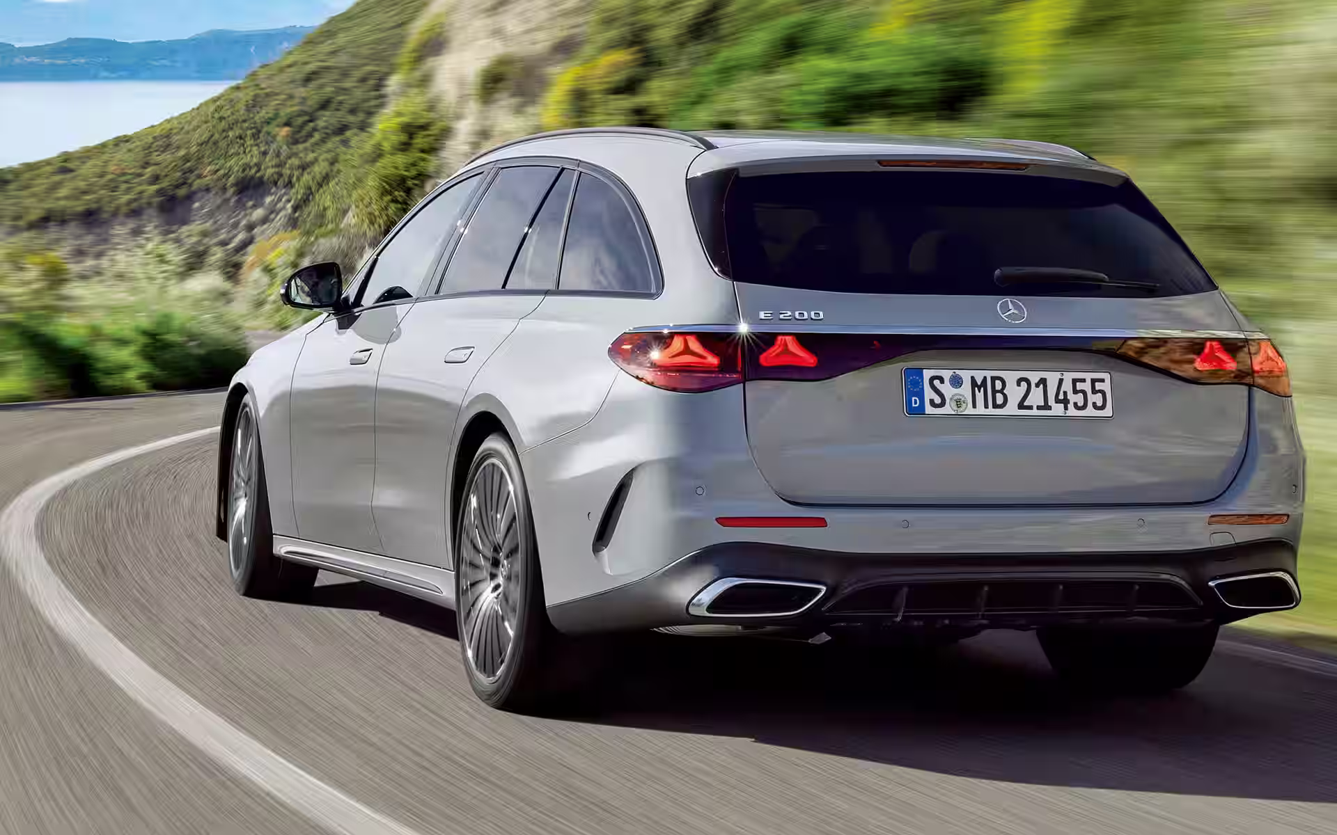 As revisões externas são precisas, não extravagantes. A Mercedes escureceu os retrovisores externos, o spoiler dianteiro, os skirts laterais, o para-choque traseiro e as barras de teto, todos pontos de contato essenciais em um carro deste porte. No sedã, essas edições se situam sob uma linha de teto mais longa e um tratamento de porta-malas mais formal; na Station Wagon, as barras de teto e o detalhamento traseiro são ainda mais visíveis porque o estilo da carroceria expõe naturalmente mais da estrutura superior.