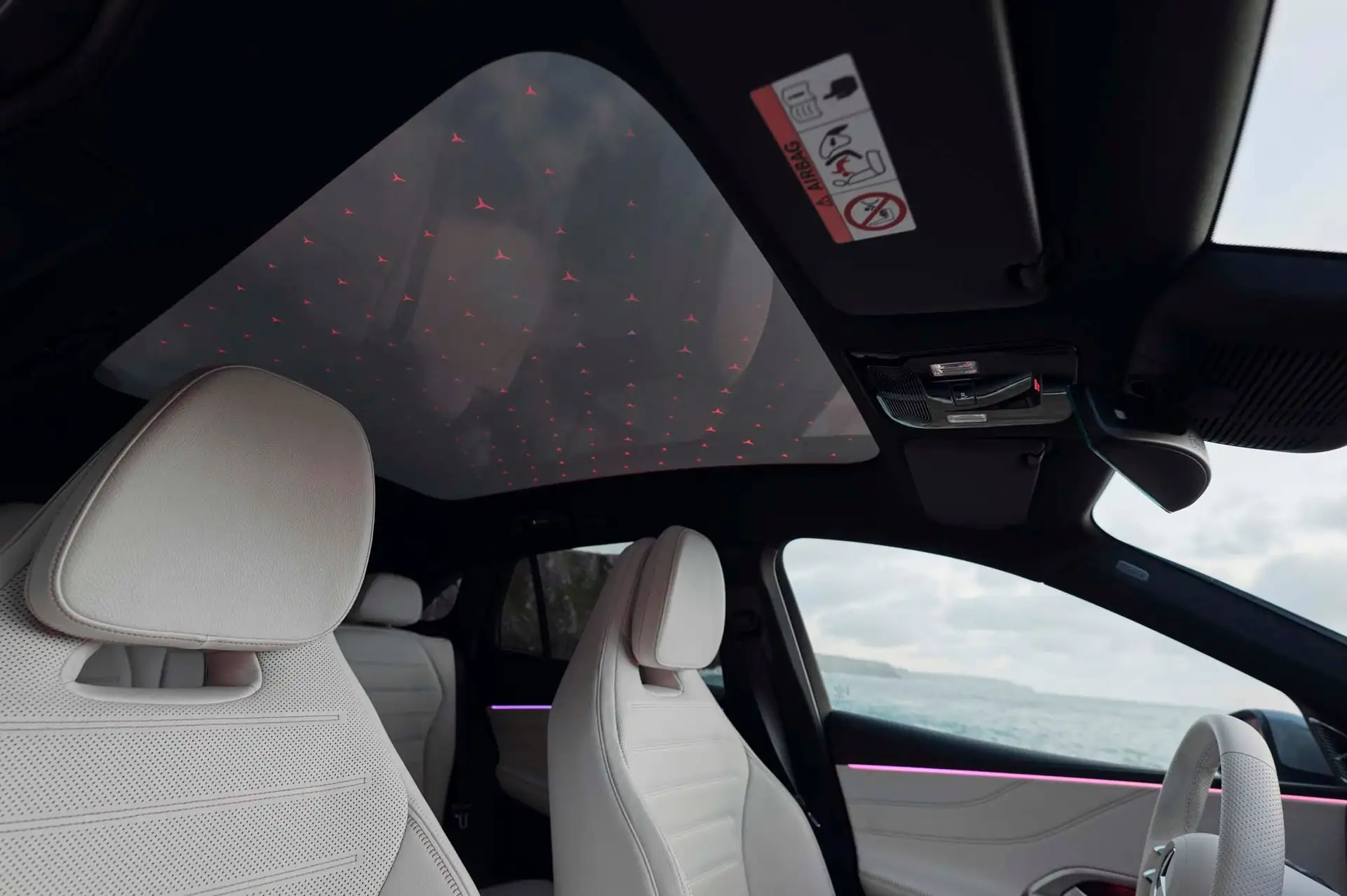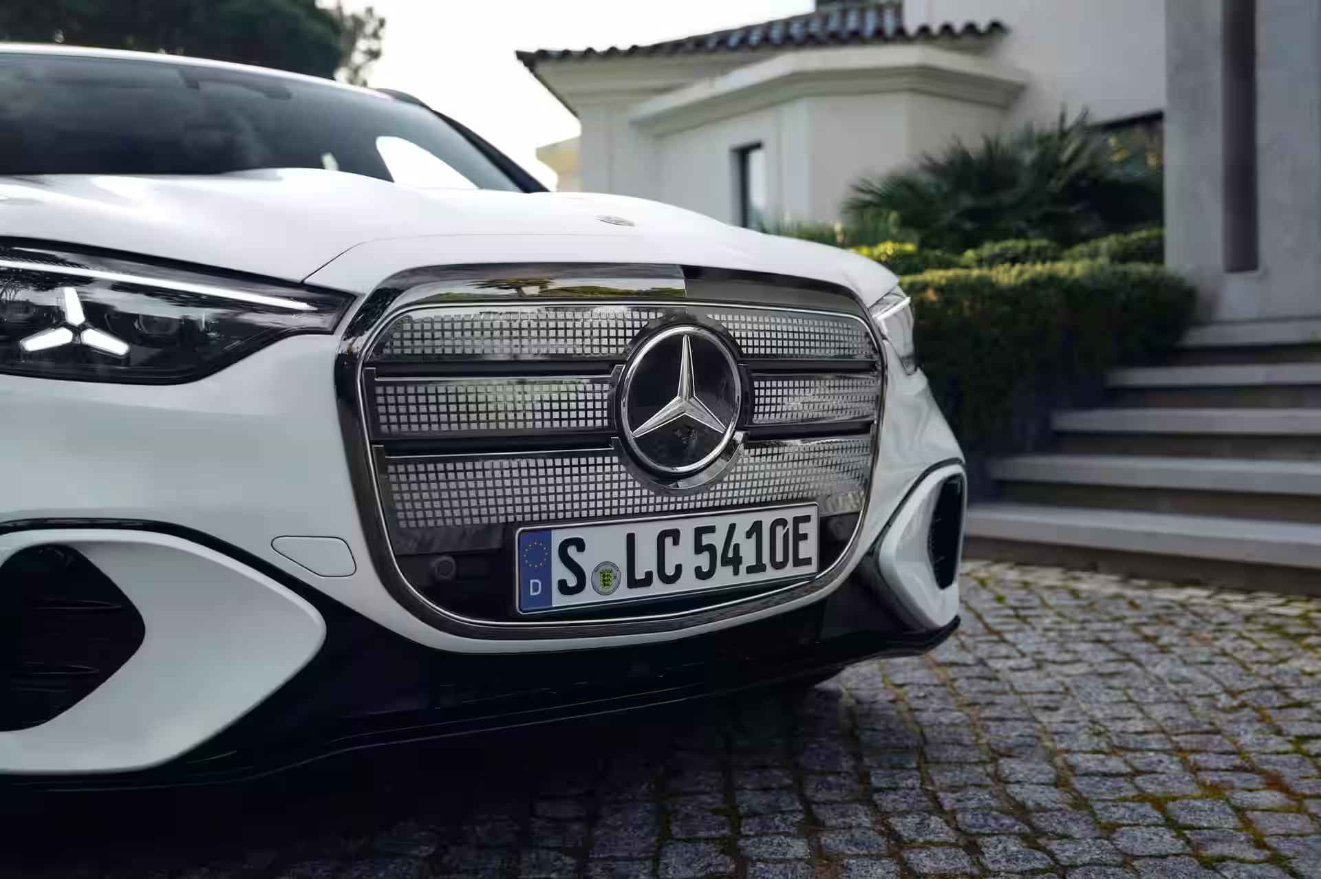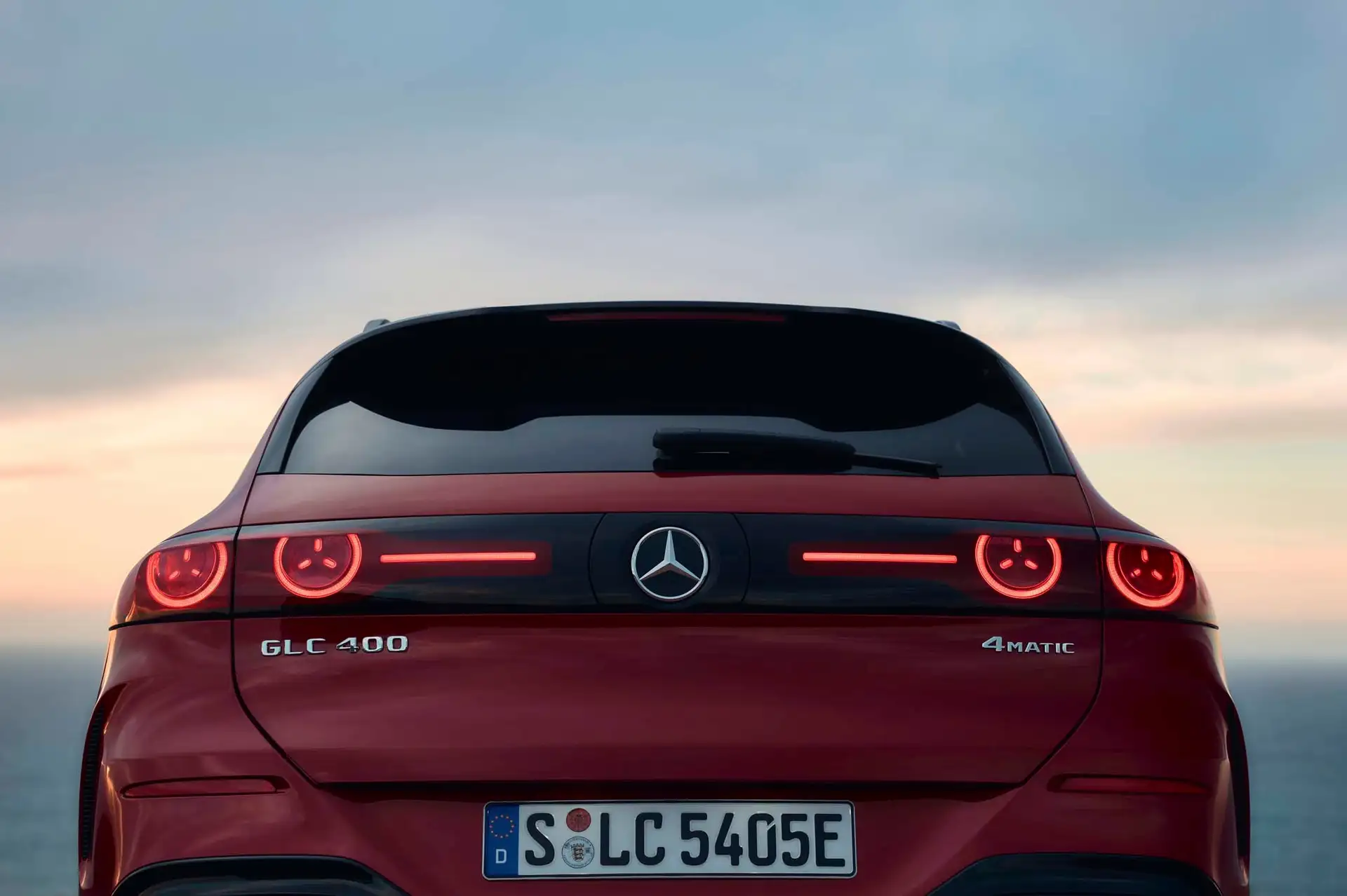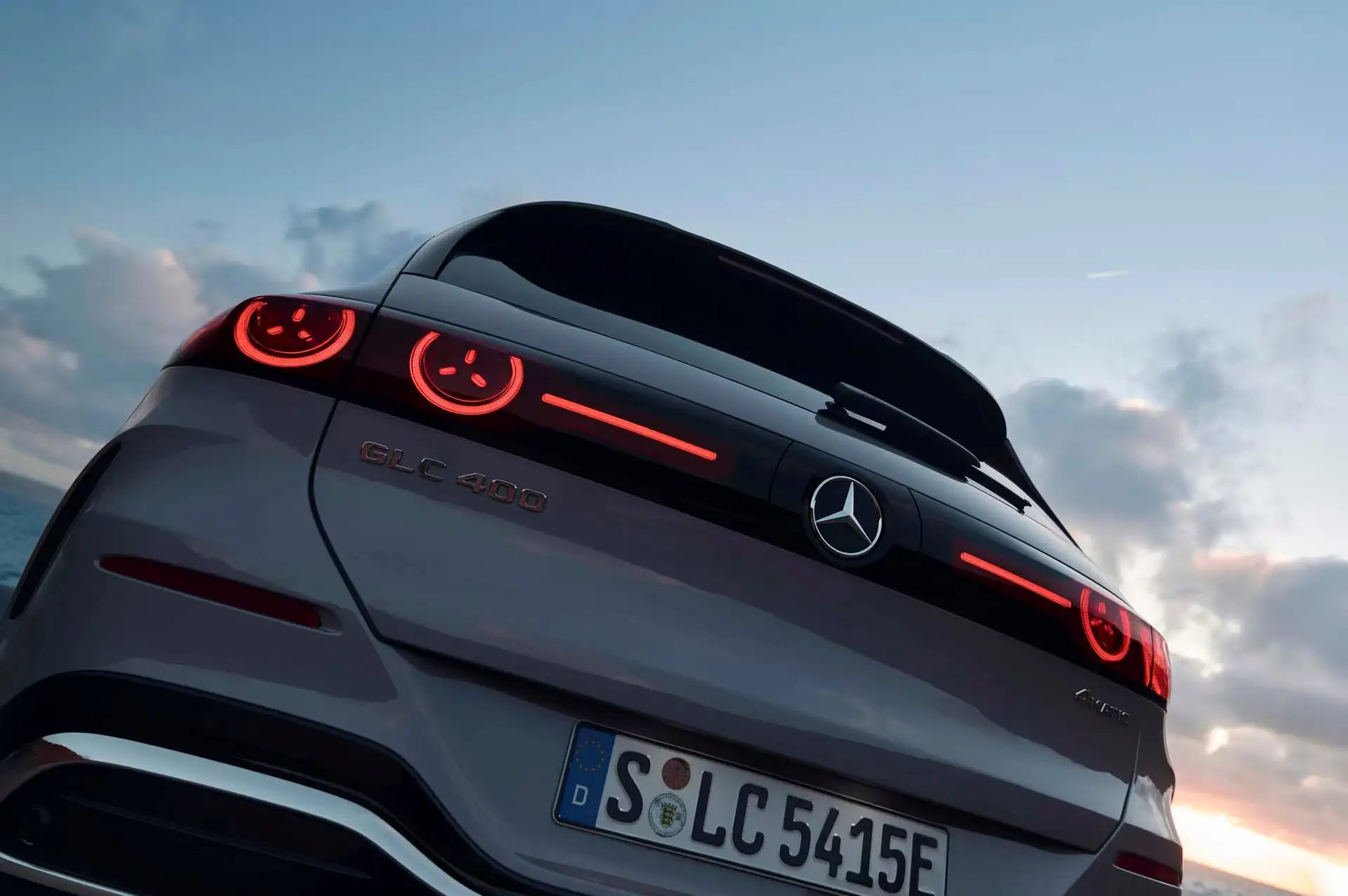 A inspiração remete ao clássico Mercedes-Benz W111 de 1959, reinterpretado em linguagem moderna. Em algumas configurações, essa peça ainda pode receber pequenos LEDs integrados, capazes de executar uma sequência luminosa de boas-vindas. Pode soar teatral, mas funciona. Em vez de tentar esconder sua identidade elétrica sob uma carroceria anônima, o GLC400 Electric assume uma presença mais forte, quase escultórica.