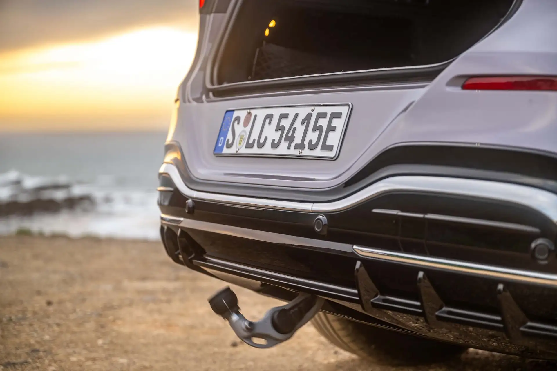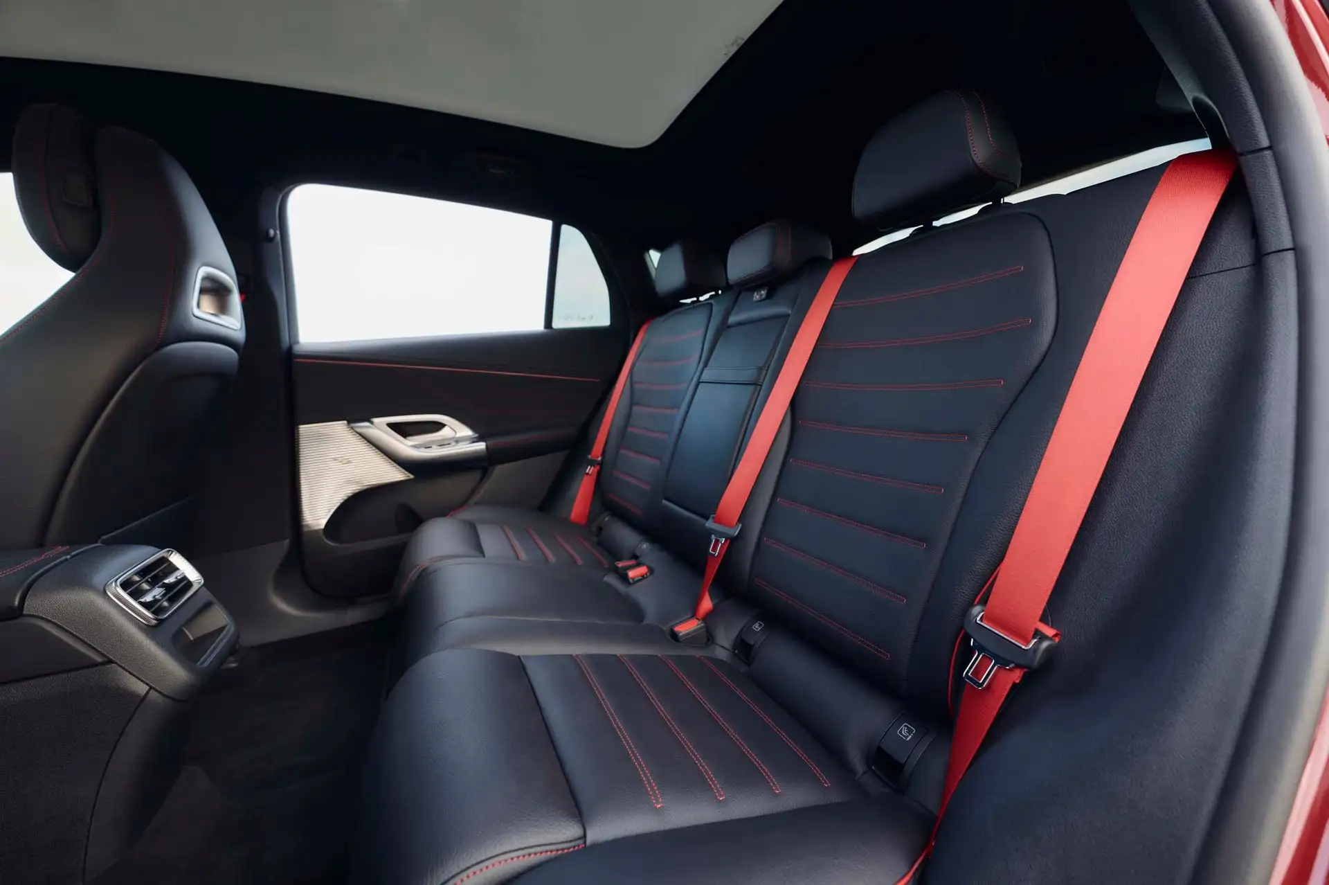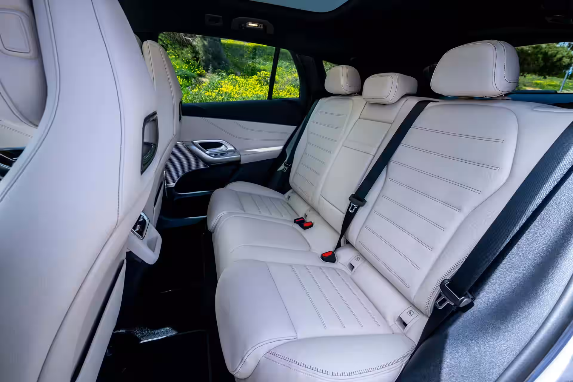 As dimensões também explicam parte dessa mudança de percepção. O GLC elétrico usa uma plataforma inédita para a versão a bateria e cresceu em pontos-chave. Ele mede aproximadamente 4,84 metros de comprimento, com entre-eixos de 2,97 metros, números que o colocam em uma posição mais generosa por dentro do que o GLC a combustão. O ganho não é só teórico. Passageiros do banco traseiro têm mais espaço para pernas e cabeça, enquanto o assoalho plano melhora a sensação de cabine arejada.
