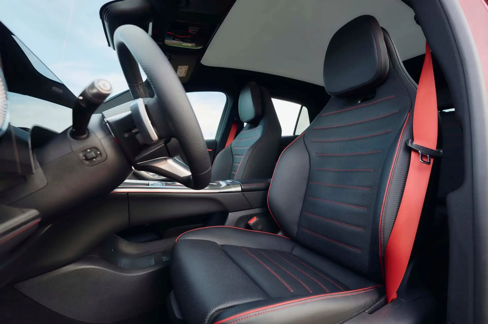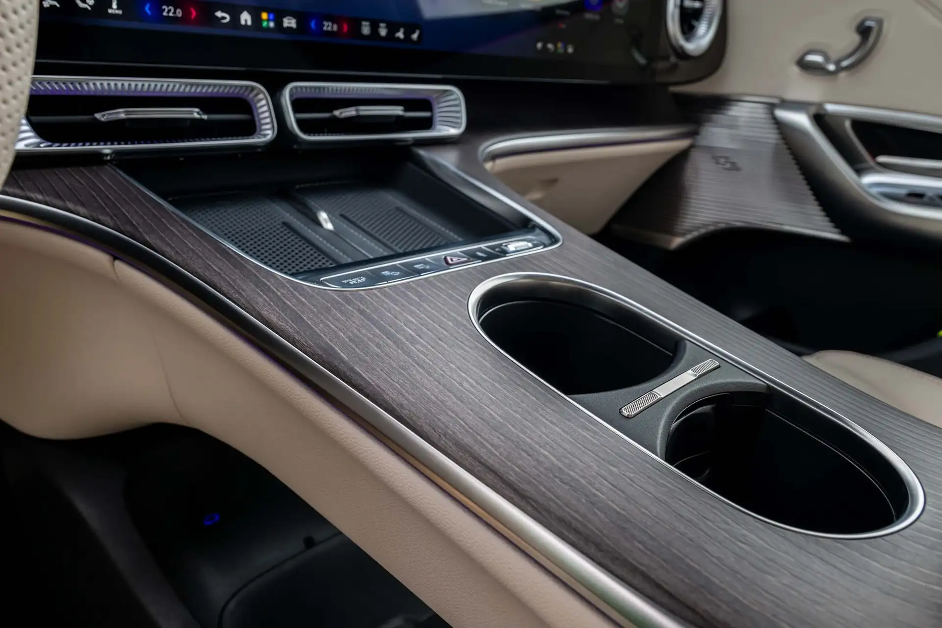 Se o exterior chama atenção, o interior é o que realmente posiciona o GLC400 Electric como produto de luxo tecnológico. O acabamento mistura couro Nappa, madeira de poro aberto, fibra de carbono e superfícies metálicas com aparência refinada. A Mercedes também oferece uma opção de cabine totalmente vegana, com certificação dedicada, algo relevante para consumidores que exigem coerência ambiental além do trem de força elétrico.