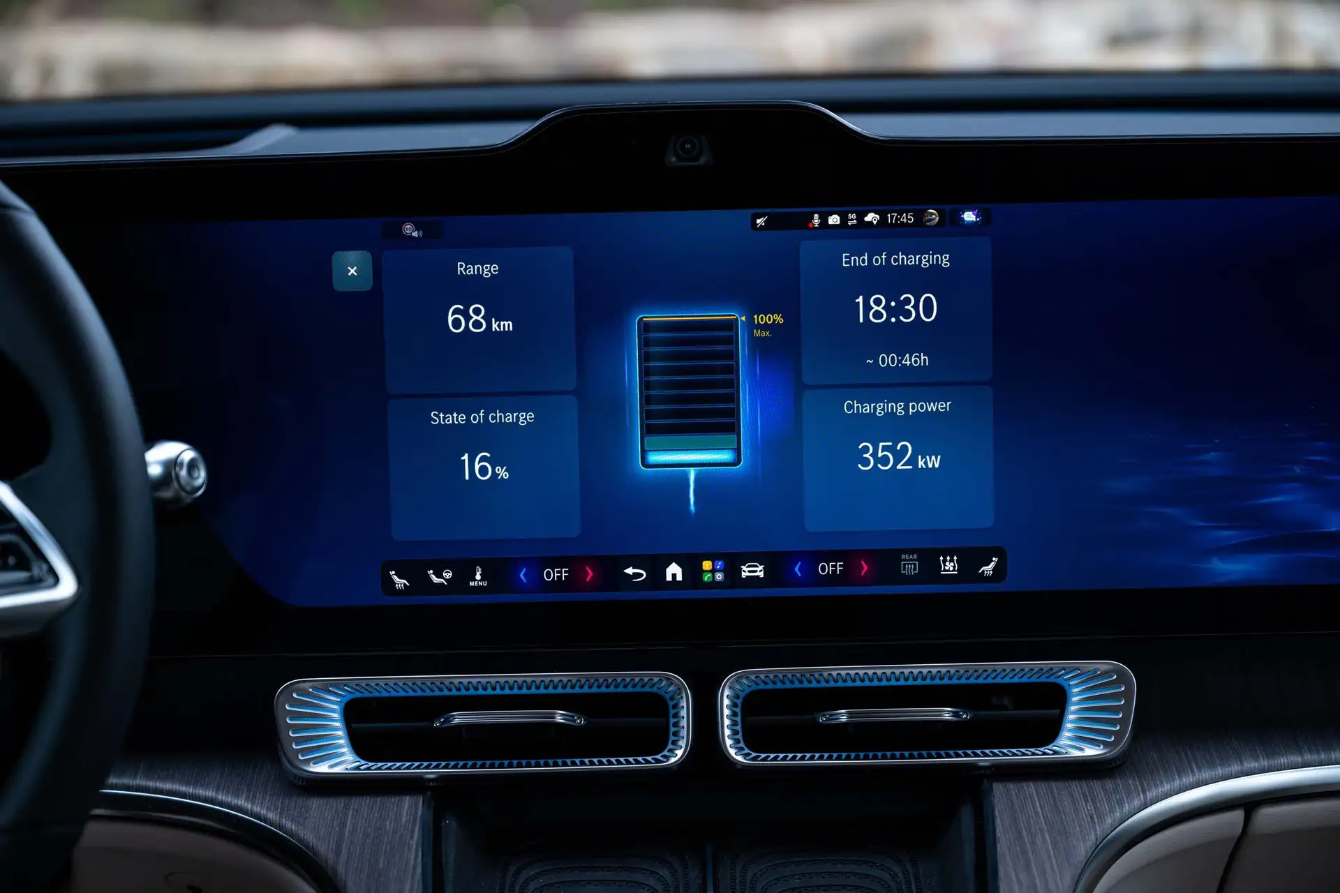 Na prática, isso significa pico de recarga DC de até 330 kW. Em condições ideais, a marca fala em ir de 10% a 80% em 22 minutos. Esse número coloca o GLC400 Electric entre os modelos mais competitivos do segmento quando o assunto é tempo parado no carregador. Em um mercado onde autonomia vende manchete, mas velocidade de recarga define a experiência real, esse detalhe pesa muito.