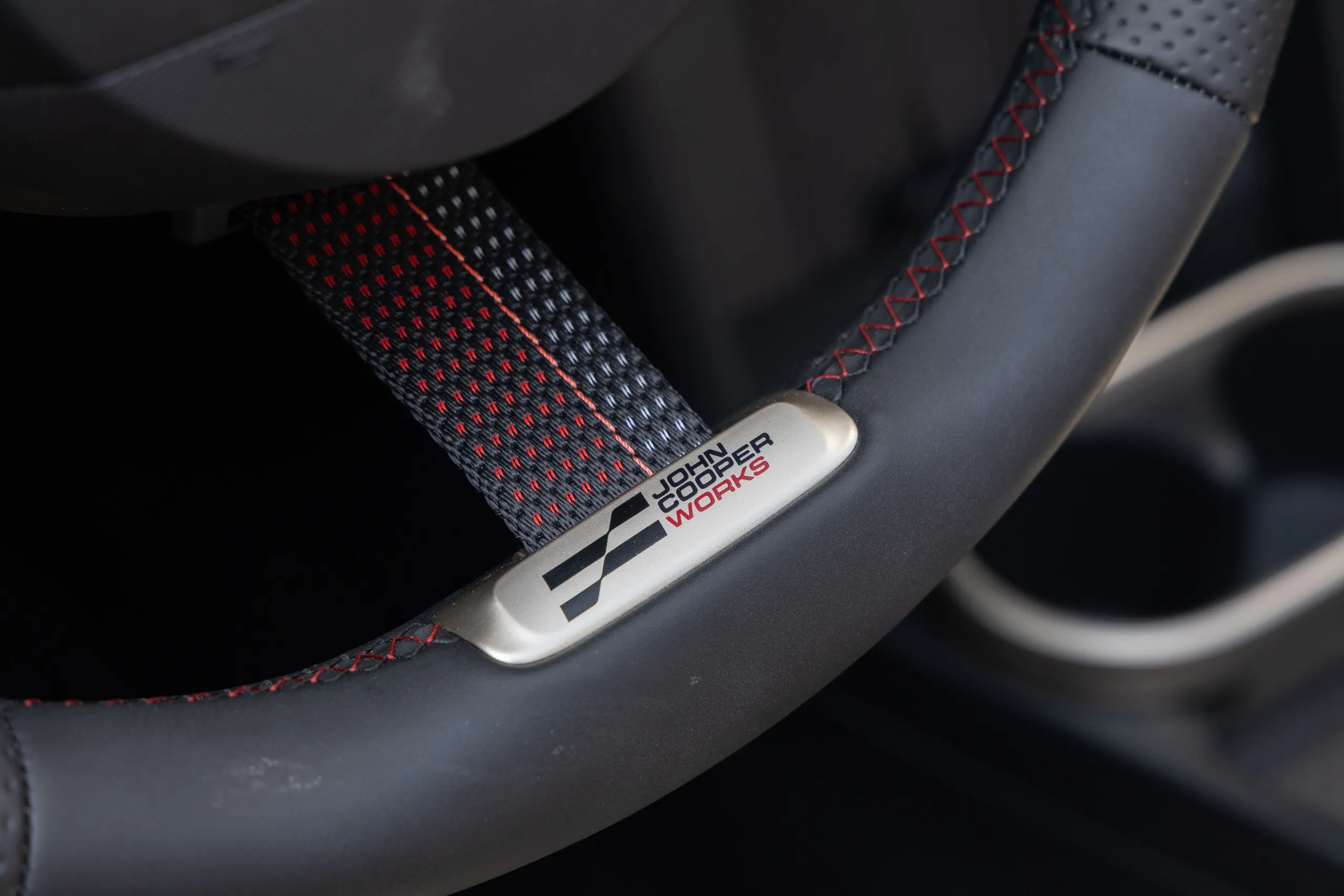De lado, as rodas de liga leve de 17 polegadas (com opção de 18″) e as pinças de freio vermelhas com a assinatura JCW não deixam dúvidas sobre a vocação do carro. Na traseira, o destaque é o novo escapamento central único (embora exista uma segunda saída oculta), conferindo um visual mais limpo e moderno, além do spoiler esportivo no teto. O interior também recebeu atenção especial, com bancos esportivos JCW revestidos em Vescin (um couro sintético de alta qualidade) com costuras vermelhas contrastantes, que oferecem excelente apoio lateral. O volante esportivo JCW, agora aquecido em algumas versões, e detalhes em malha preta/vermelha no painel complementam a atmosfera racing.