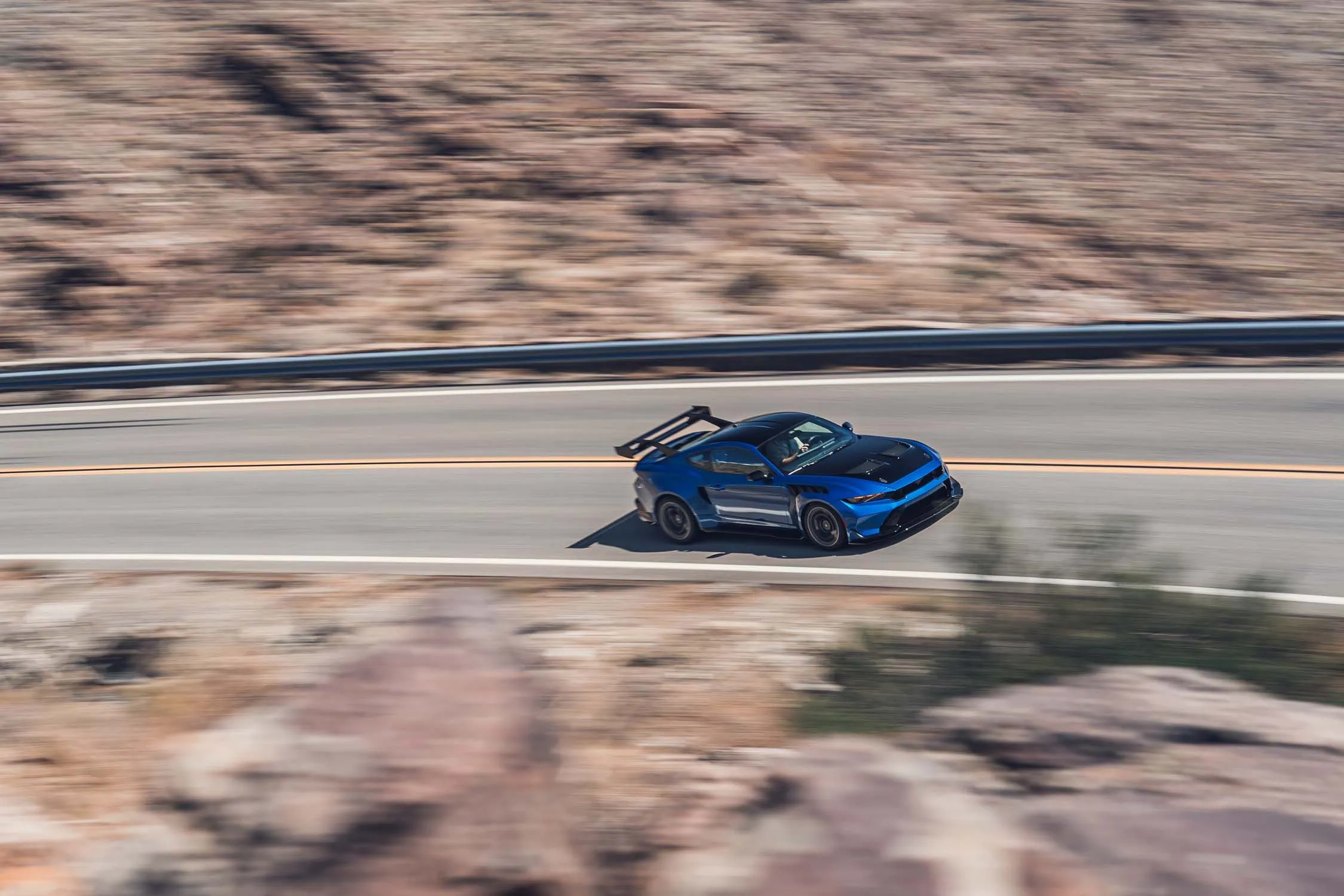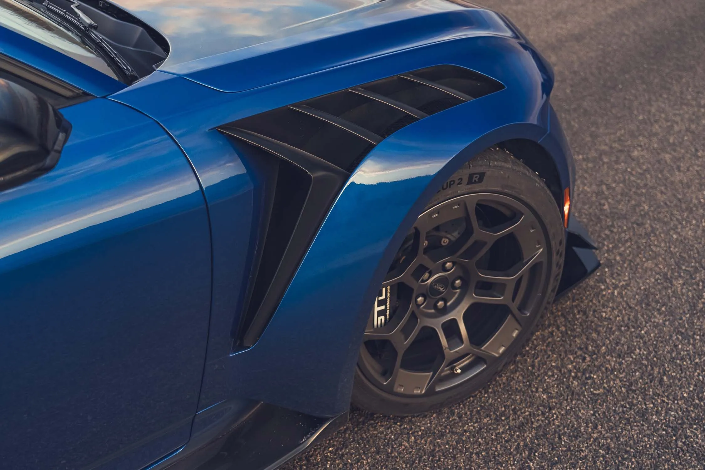Em termos de aerodinâmica, o Mustang GTD surpreende. O pacote Performance opcional dá direito a asas móveis ativas, flaps dianteiros e rodas de magnésio, permitindo gerar mais carga vertical que rivais típicos do segmento. Nada menos que 1.17g de lateral no skidpad — número digno de protótipos de competição.