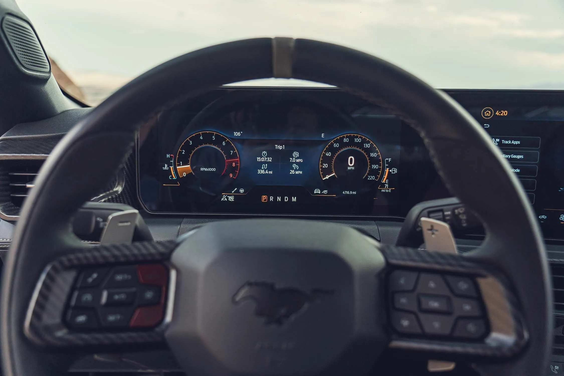 Ao volante do Mustang GTD, o que impressiona não é apenas a brutalidade da aceleração — com 0 a 100 km/h em menos de 3 segundos — mas também a estabilidade em altas velocidades e o controle em curvas onde a física parece ignorada. Tudo isso com um rodar surpreendentemente suave, graças ao sistema adaptativo Multimatic, herdado de carros de corrida de endurance.