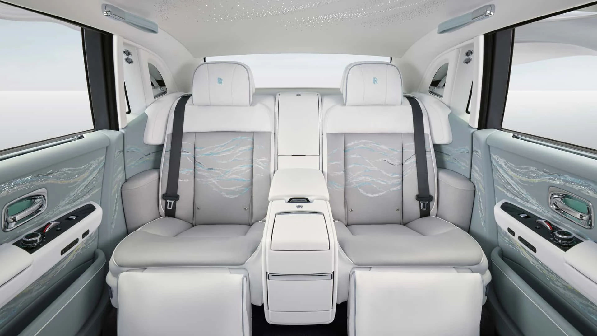 Mas não para por aí, não! A densidade de bordados é a mais alta já vista em um carro da Rolls-Royce. As portas traseiras e os assentos são decorados com nada menos que 869.500 pontos de bordado em um tecido quase brilhante. E, à noite, a mágica acontece: o bordado ganha um brilho hipnotizante, fazendo o interior parecer que brilha de dentro para fora. É uma experiência sensorial que faz qualquer passeio ser inesquecível.