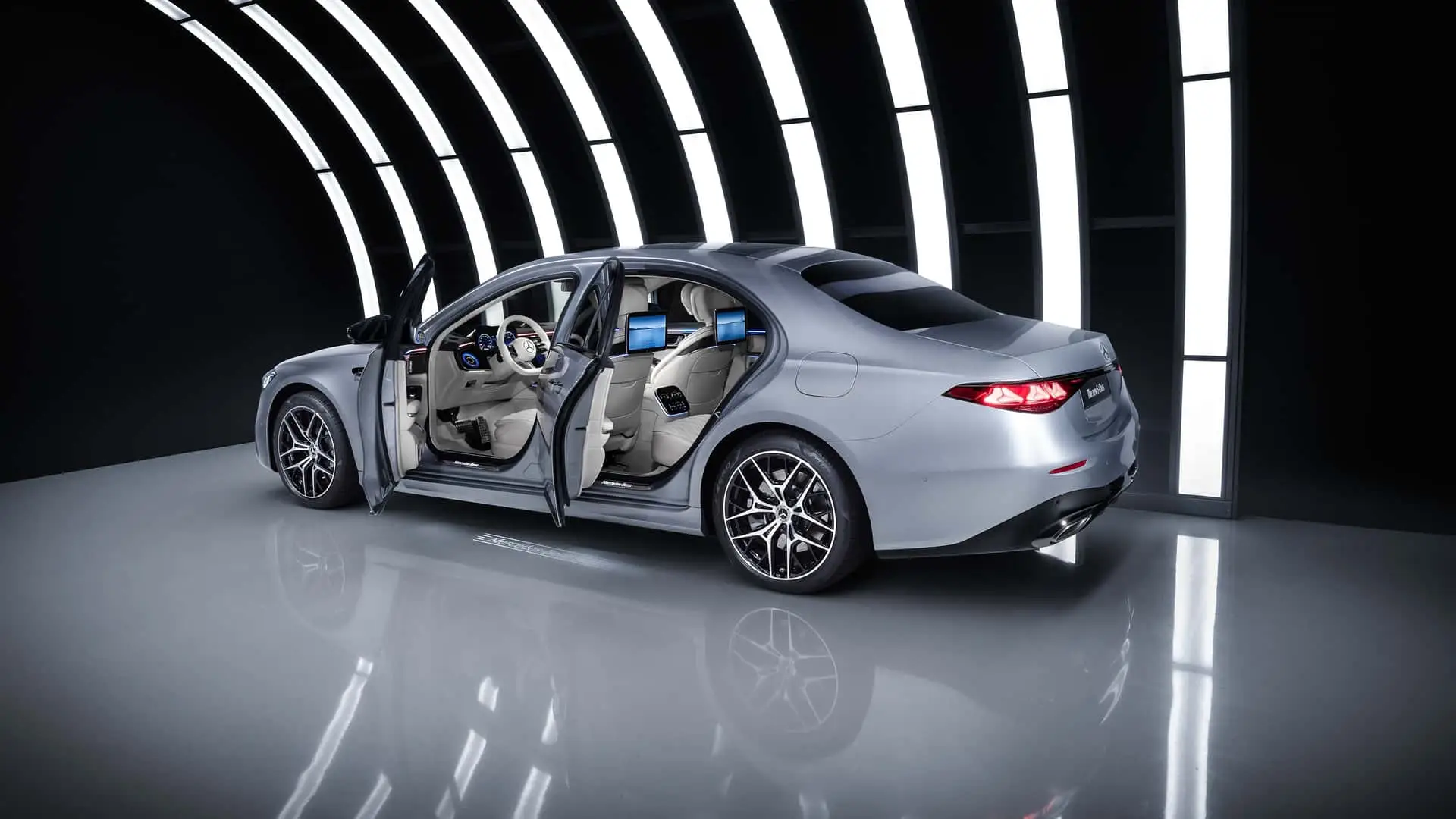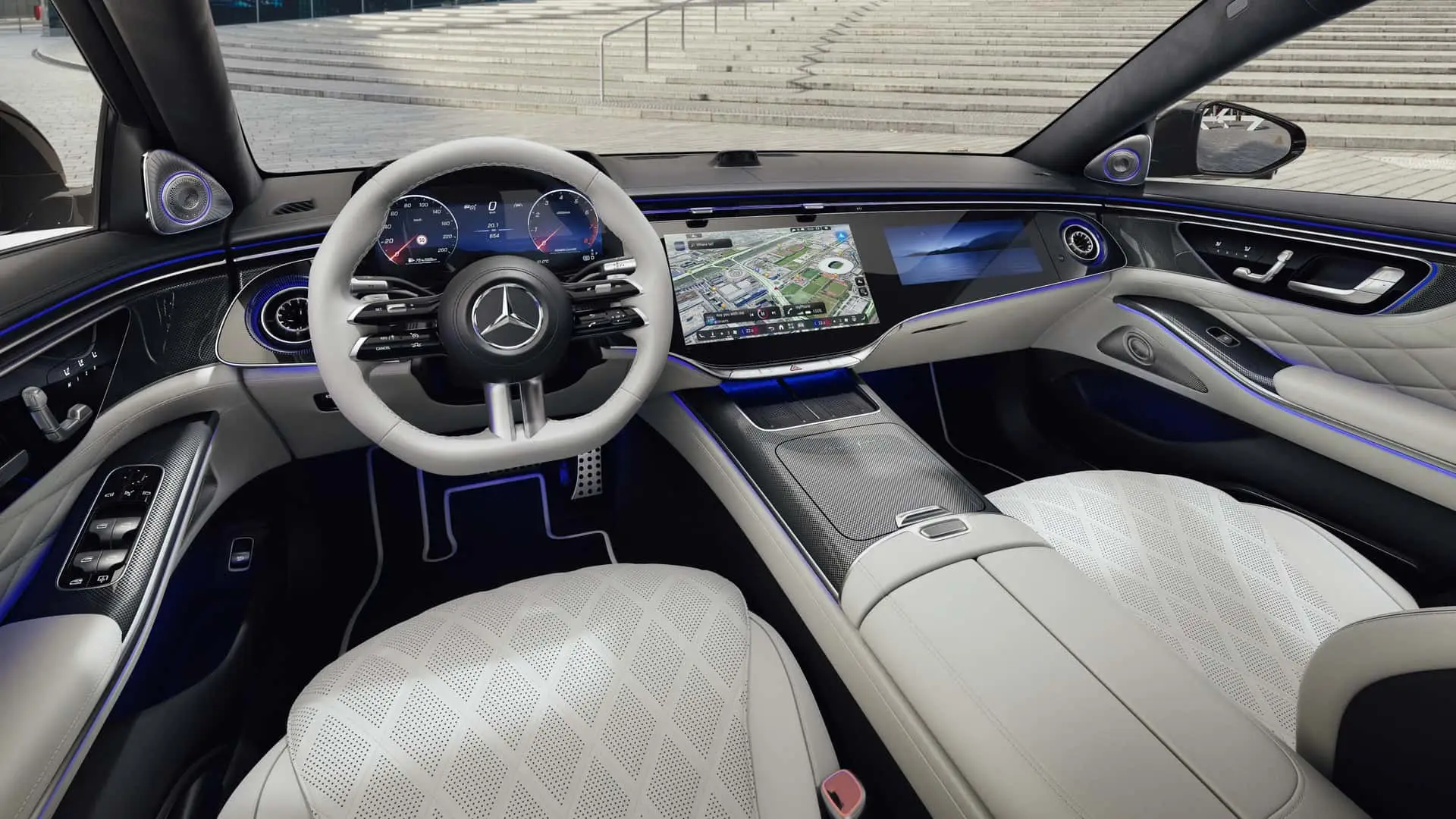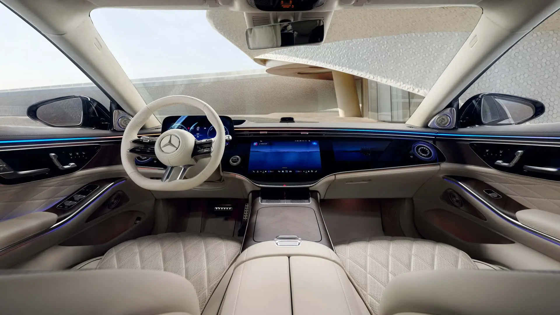 Интерфейс MBUX развивается, чтобы интегрировать генеративный AI, предлагая контекстные подсказки, ответы на естественном языке и встроенную интеграцию с картографическими сервисами. Hyperscreen заменен на Superscreen — сегментированный в три основных дисплея (приборная панель 12,3″, центральный дисплей 14,3″ и дисплей пассажира 12,3″), что подчеркивает видимость и удобство использования без ущерба для визуального эффекта.