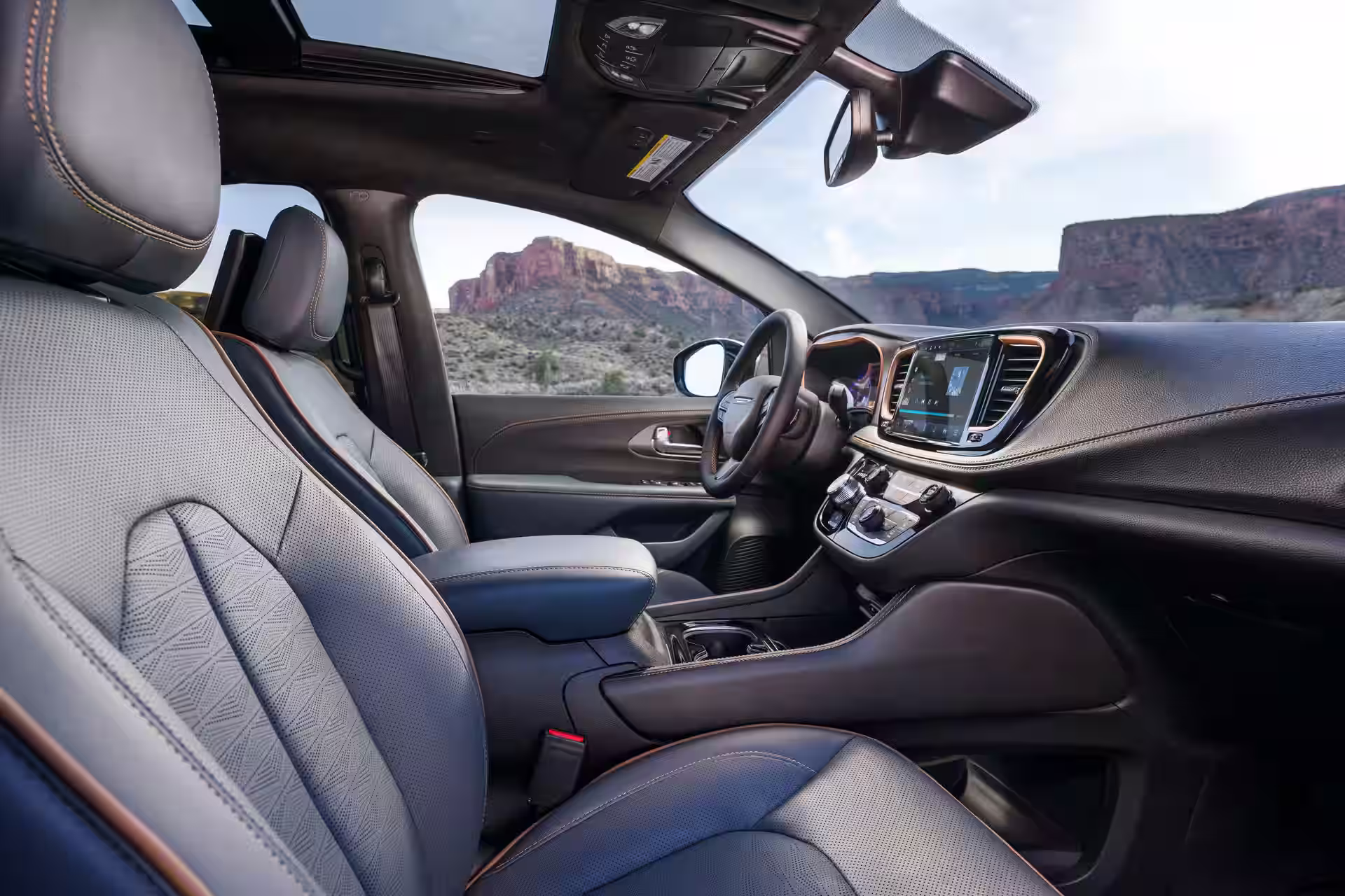 แถวหน้าให้ความรู้สึกสบายและจัดวางอย่างชาญฉลาด โดยมีพื้นที่เก็บของที่กว้างขวาง ช่องเก็บของที่มีประโยชน์ ที่วางแก้ว และการมองเห็นที่ทำให้การขับขี่ในเมืองและการจอดรถน้อยเครียดมากขึ้น ชไรสเลอร์เข้าใจว่าผู้เป็นเจ้าของมินิแวนไม่ได้ต้องการแค่พื้นที่สำหรับคน แต่ต้องการพื้นที่สำหรับชีวิต ซึ่งหมายถึงโทรศัพท์ ขนม ขั้วชาร์จ ผ้าเช็ดทำความสะอาด ขวด แท็บเล็ต เป้สะพายหลัง และวัตถุสุ่มที่ดูเหมือนจะเพิ่มขึ้นในรถยนต์ของครอบครัวทุกคัน