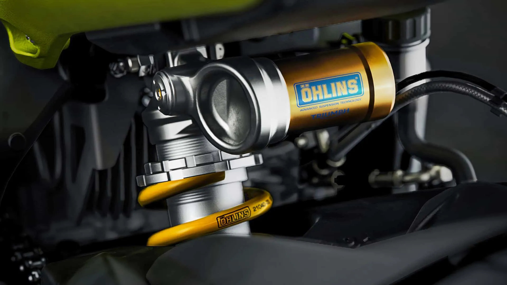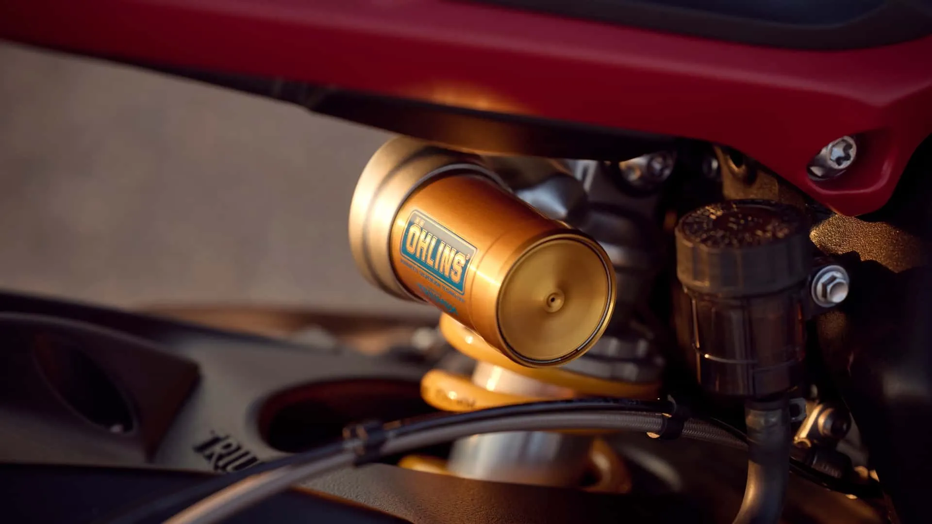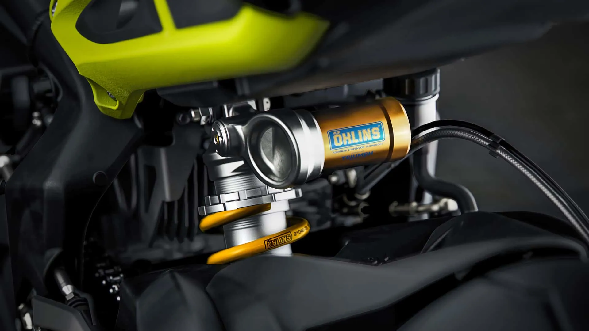 焦点当然在前悬架。Street Triple RS 使用 Showa 叉,RX 和 Moto2 配备了 Öhlins NIX30 全可调前悬架。这意味着可以精确控制压缩、回弹和预载,让骑手可以根据不同赛道、条件和驾驶风格微调机械行为。这一升级不仅仅是奢华,而是追求在赛道上每一秒的必要条件。Öhlins 作为性能的象征,提供卓越反馈、更高的稳定性(尤其在极限刹车时)和卓越的吸震能力,让骑手信心十足、机动自如。这款升级的前悬架完美配合 RS 版本已有的 Öhlins 后避震,形成高端悬挂系统的强大组合。